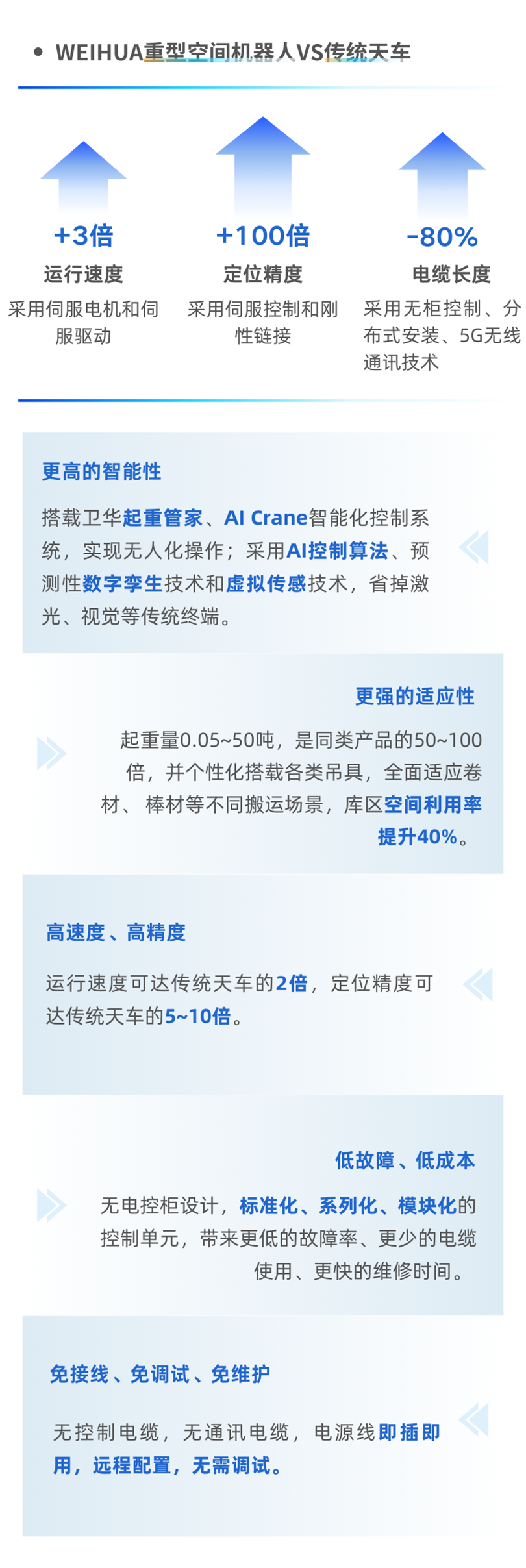新产品将数字孪生、AI控制算法、人工智能、虚拟传感等技术与起重产品充分结合,输出了重型空间机器人、重型板材搬运机、多对多远程控制系统等多个智慧搬运方案,解决了客户成本控制难、生产效率低、环境恶劣、维保困难等诸多痛点和难点。